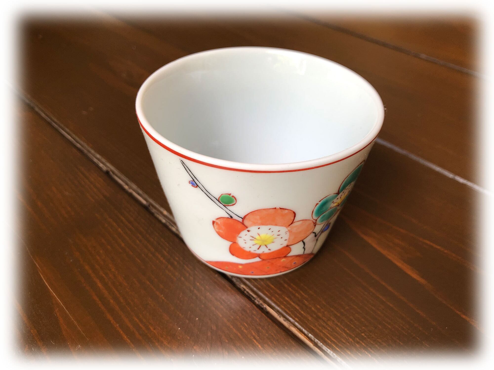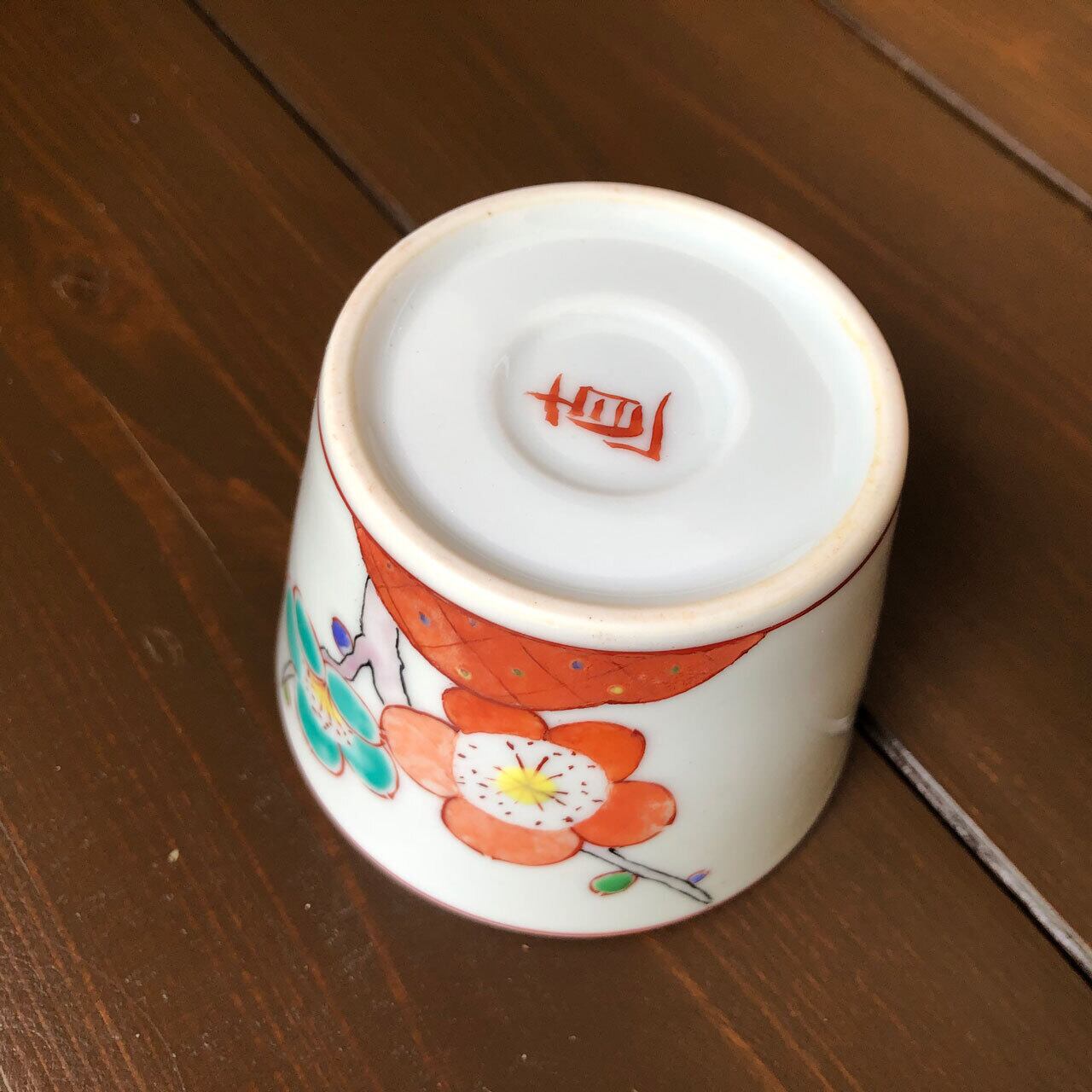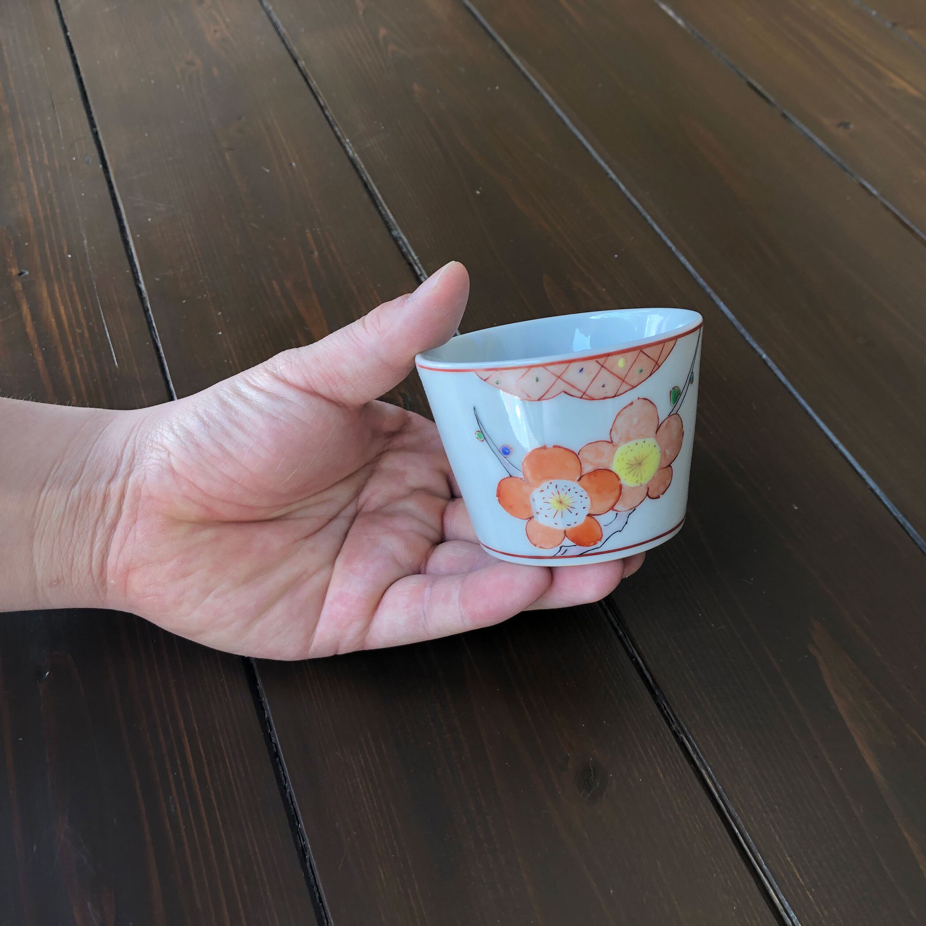 ■枝や茎は黒の線で花や土(雲?)は赤い線と分けて描き、少し遠近感を演出しています。花びらは呉須を含ませた上から筆先に水を含ませ、一枚一枚、花の中心から外側に伸ばして描きます。上絵の場合、水を含ませることは余りありません。梅の花の蕾は一つ一つカラフルにし、遊び心のある作品となっております。どれも、各々手作りにつき、申し訳ありませんが、在庫は一点のみとなります。